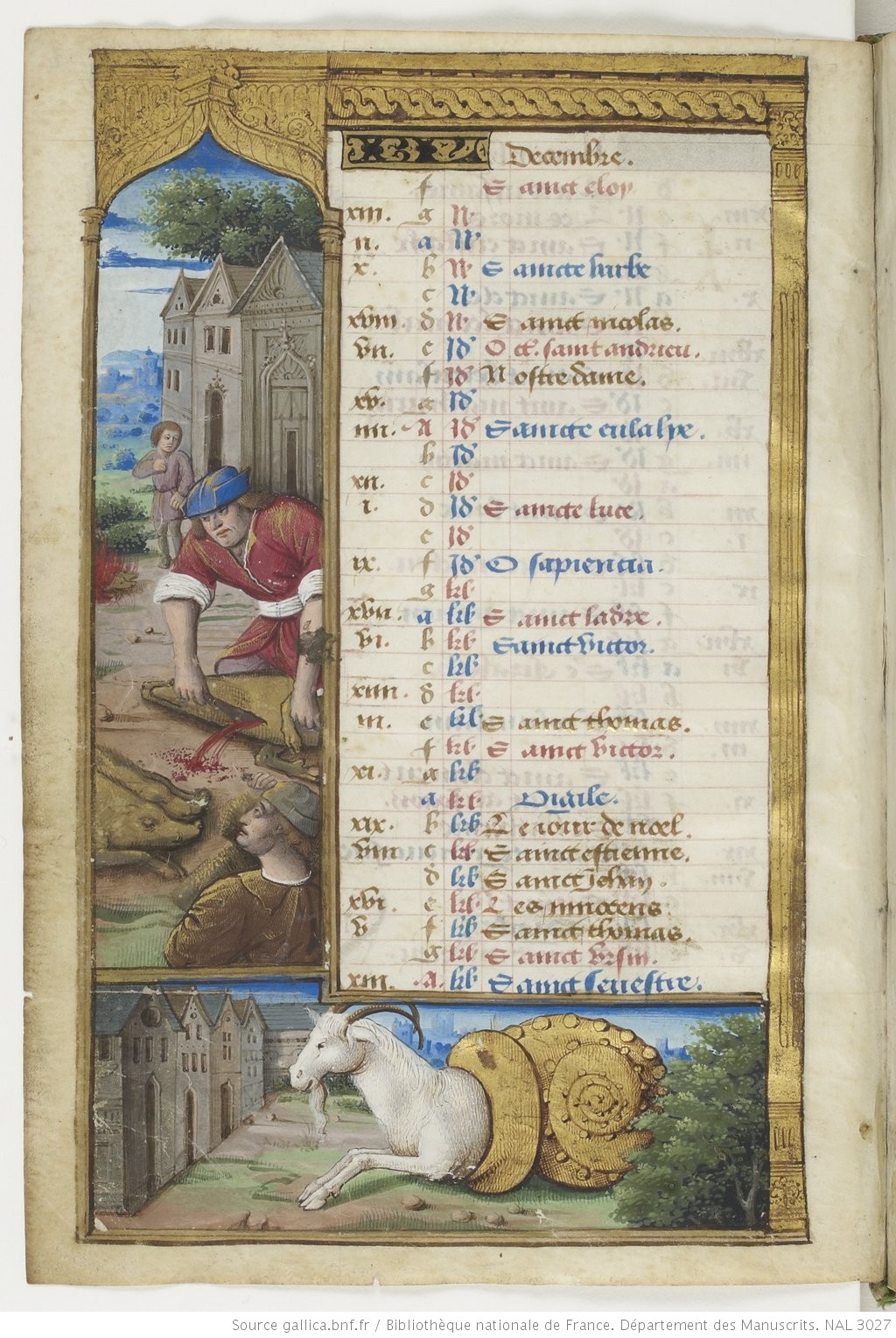 “December”, kalendar page from Les Petites Heures d’Anne de Bretagne (The Little Hours of Queen Anne of Bretagne), by the Maître des Triomphes de Pétrarque. From Bibliothèque nationale de France, Paris (France).