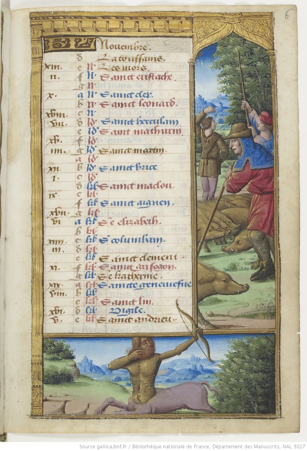 “November”, kalendar page from Les Petites Heures d’Anne de Bretagne (The Little Hours of Queen Anne of Bretagne), by the Maître des Triomphes de Pétrarque. From Bibliothèque nationale de France, Paris (France).