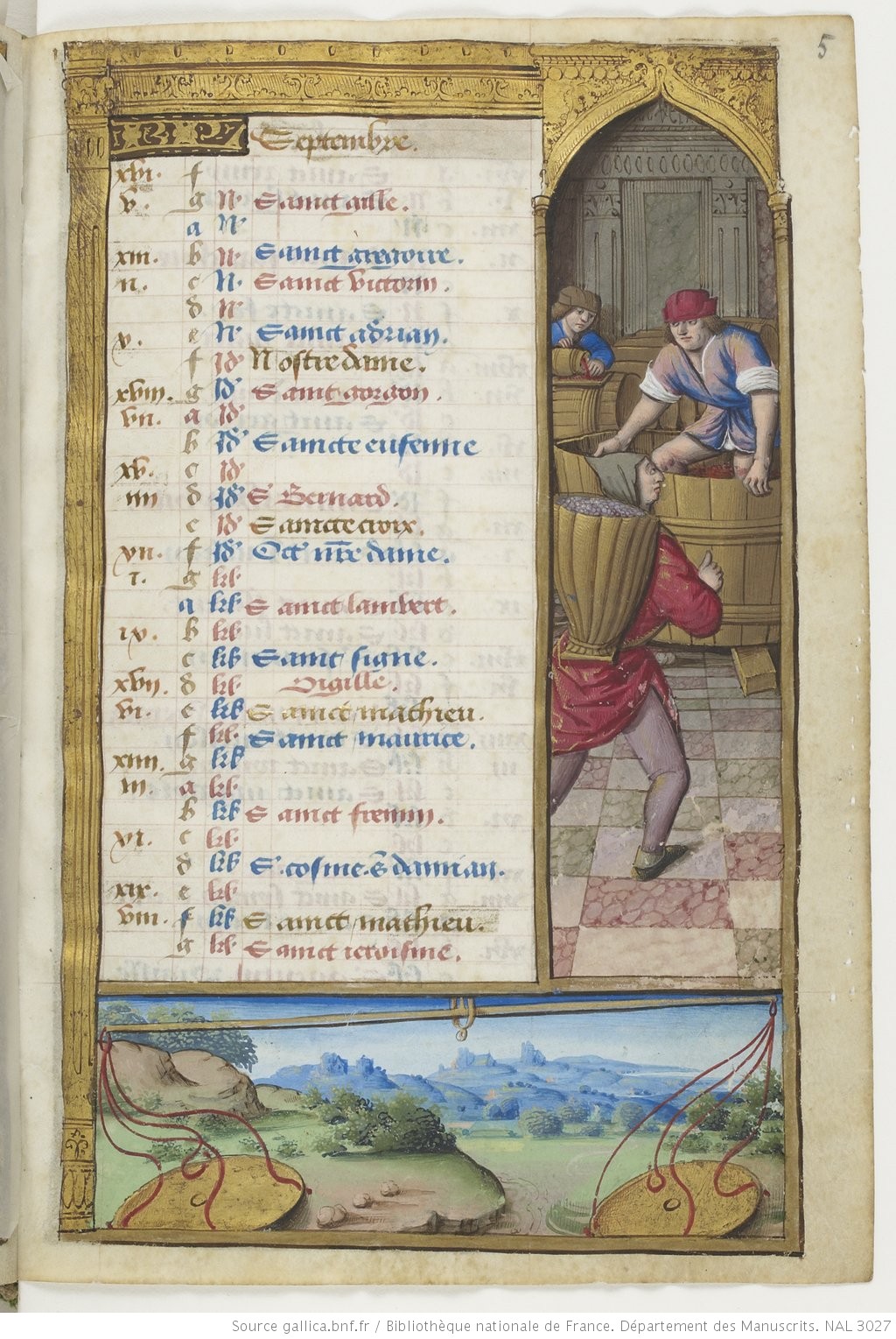 “September”, kalendar page from Les Petites Heures d’Anne de Bretagne (The Little Hours of Queen Anne of Bretagne), by the Maître des Triomphes de Pétrarque. From Bibliothèque nationale de France, Paris (France).